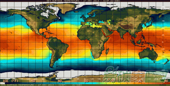 美國(guó)國(guó)家海洋和大氣管理局(NOAA)于2015年5月27日(下圖)和2014年5月27日(上圖)發(fā)布的全球海洋平均溫度。