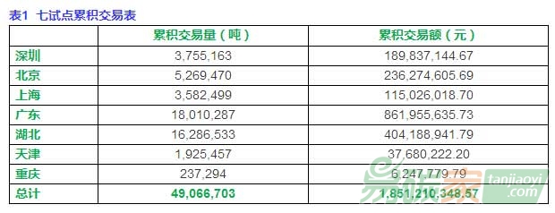 北京、上海仍舊只有一日出現(xiàn)交易,交易量均大跌;廣東交易量大跌;湖北交易量有所下降;天津、重慶本周無交易。七試點碳市累積成交數(shù)值(交易量、交易額)請參考下表1。