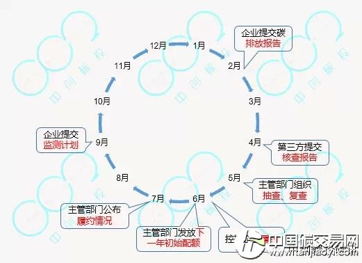 第三方機(jī)構(gòu)建立一個(gè)常規(guī)的報(bào)送核查流程,保障配額的真實(shí)有效。碳交易流程如下圖所示,其中報(bào)送核查工作占了很大比重(圖中時(shí)間節(jié)點(diǎn)僅為舉例,實(shí)際以政府公文為準(zhǔn)):