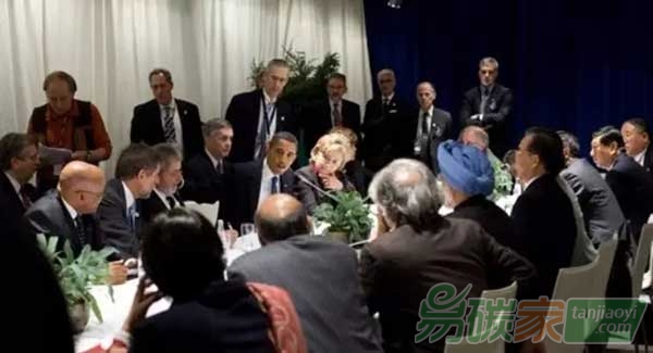 美國總統(tǒng)奧巴馬在2009年的哥本哈根氣候大會上就核查各國減排這一條款進行談判。圖片來源:The White House