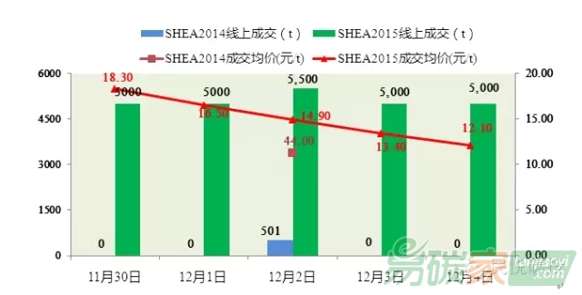 上周上海碳市12月02日,有配額SHEA14成交,成交量為501噸。SHEA15每日成交量較一致,總成交量為2,5500噸。成交均價(jià)在12.10元/噸~18.30元/噸范圍內(nèi)波動(dòng)。