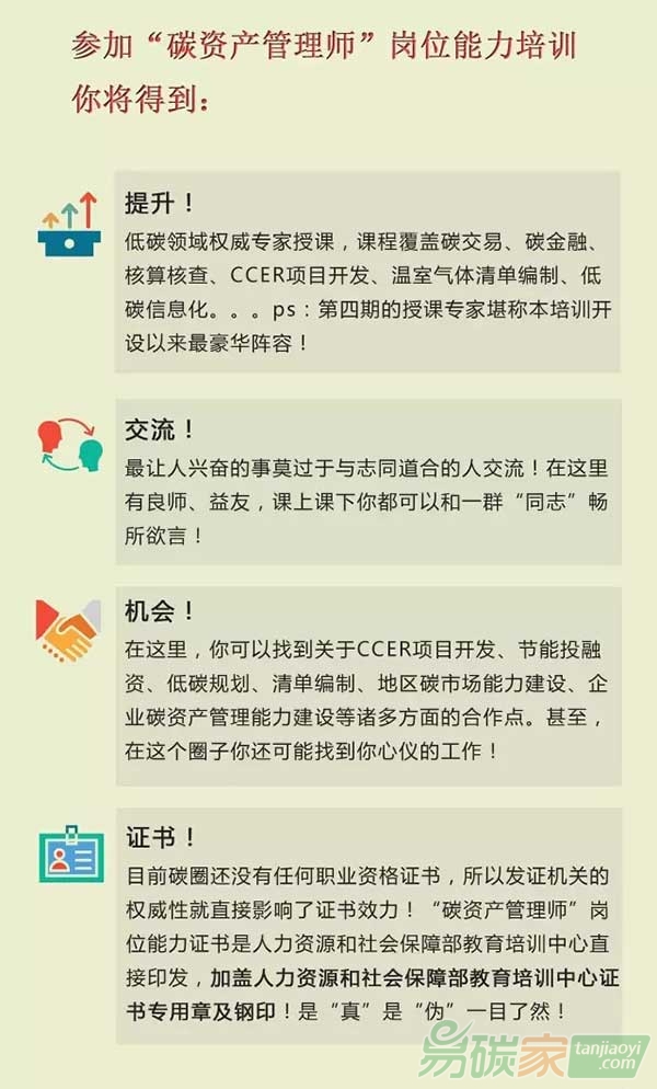 政策、掌握碳市場交易規(guī)則、能熟練使用碳資產(chǎn)管理相關(guān)工具的專業(yè)性人才對企業(yè)有效利用市場手段管理碳資產(chǎn)、實(shí)現(xiàn)碳資產(chǎn)的保值增值意義重大,也將是企業(yè)在碳約束時代搶占市場先機(jī)、實(shí)現(xiàn)可持續(xù)發(fā)展的重要保證。