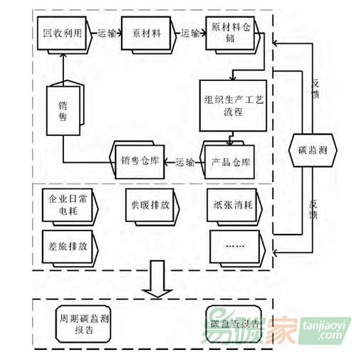碳管理部門報(bào)送運(yùn)輸信息;如是供應(yīng)商對(duì)原材料進(jìn)行運(yùn)輸,則在這一環(huán)節(jié)便不會(huì)產(chǎn)生碳排放。當(dāng)原材料進(jìn)入倉(cāng)儲(chǔ)環(huán)節(jié),由主管倉(cāng)儲(chǔ)的部門將運(yùn)進(jìn)原材料的數(shù)量、設(shè)定倉(cāng)儲(chǔ)燈光亮度,溫度等一系列信息報(bào)送到碳管理部門。組織生產(chǎn)工藝流程根據(jù)企業(yè)運(yùn)營(yíng)實(shí)際情況設(shè)定流程圖,運(yùn)營(yíng)活動(dòng)信息根據(jù)真實(shí)發(fā)生情況向碳管理部門匯報(bào);企業(yè)支持性活動(dòng)(非生產(chǎn)過程)中所產(chǎn)生的業(yè)務(wù)由主管部門將詳細(xì)信息匯報(bào)給碳管理部門即可。碳監(jiān)測(cè)與盤查報(bào)告編寫的任務(wù)由碳管理部門來完成。企業(yè)碳盤查流程可設(shè)計(jì)如圖2所示