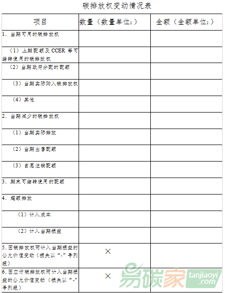 注:除“因碳排放權(quán)而計入當(dāng)期損益的公允價值變動”項目外,上表中的金額欄應(yīng)當(dāng)以資產(chǎn)負(fù)債表日碳排放權(quán)公允價值計量的金額列報。