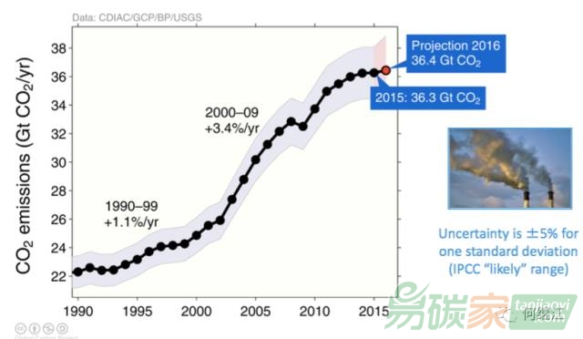 碳排放總量約為36.3GtC ,也即363億噸(1GtC為10億噸碳),與2014年持平。