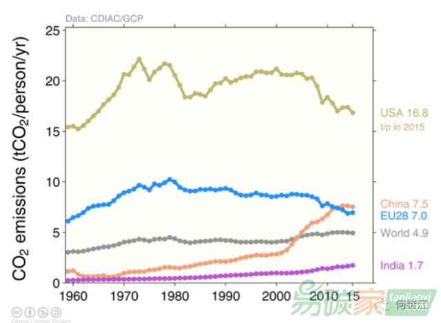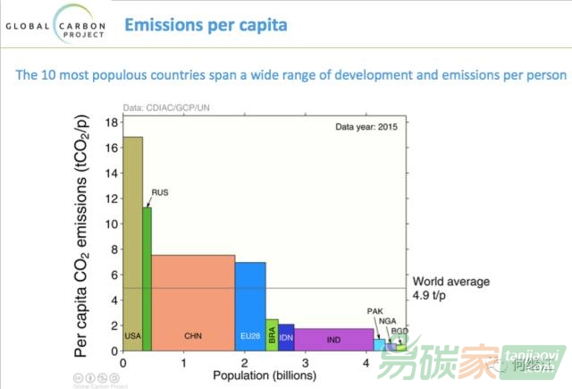 人均碳排放,中國是7.5噸,與美國相比還不到它一半,但已經(jīng)比歐盟平均水平7噸高了,全球平均是4.9噸,印度是1.7噸。
