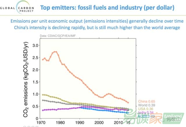 中國的單位GDP的碳排放這十年下降非常之快,但是比世界平均水平高很多,而且意外的是,相當(dāng)于印度的幾乎兩倍。