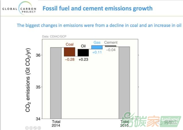 2015年與2014年相比,最大的差別是煤炭排放的減少和石油排放的增加.