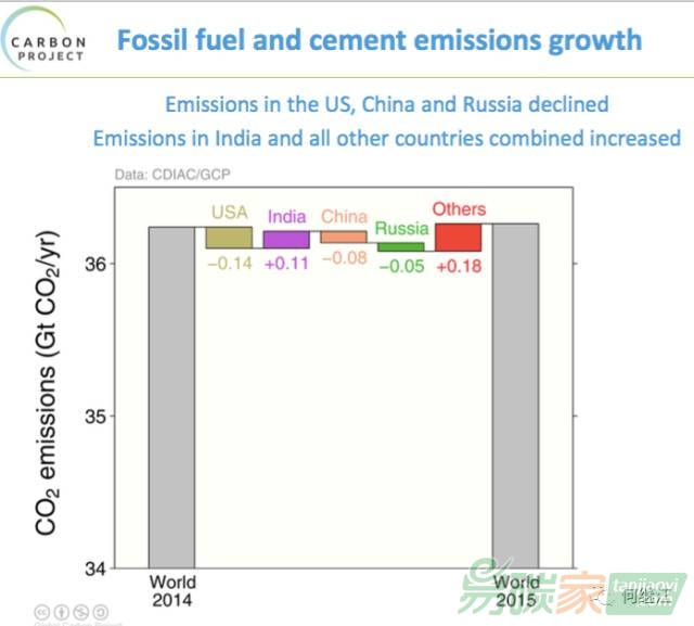 國別來看,2015年美國碳排放減少最多1.4億噸,其次是中國,大約是8000萬噸,但印度一國增加了1.1億噸。