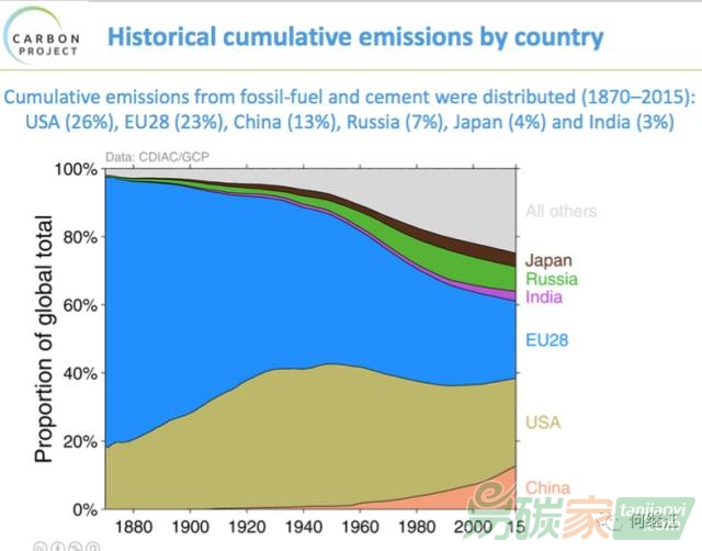 1870年-2015年的累積碳排放。開始歐盟和美國幾乎占據(jù)全部,到2015年,中國占比達到13%。美國是26%,歐盟是23%。