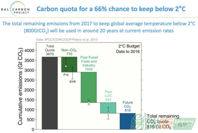 2度目標(biāo)下的全球碳預(yù)算只有8000億噸了,按目前排放速度,二十幾年就能用完。