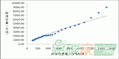 圖4 2013年新疆各地州能源消費占比情況(四)新疆碳排放量與能源消費量和地區(qū)生產(chǎn)總值的相關(guān)性分析1.碳排放量與能源消費量的相關(guān)性分析碳排放量與能源消費總量存在明顯線性關(guān)系(見圖5),兩者線性回歸方程為:Y=0.667X-70.11。上式表明能源消費總量(X)每增加一個單位,碳排放量(Y)就增加0.667個單位,兩者決定系數(shù)達到啊0.996。