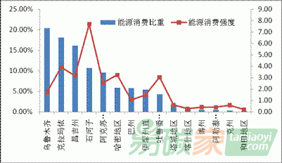 從圖4可以看出,石河子市、克拉瑪依市、哈密地區(qū)、昌吉地區(qū)、吐魯番地區(qū)能源消費強度遠高于其他地州市、特別是石河子市能源消費強度達到7以上,表明其單位經(jīng)濟產(chǎn)出的能源消費量大,對全區(qū)能源消費增長的貢獻大于其對經(jīng)濟增長的貢獻,能源利用效益不高。控制我區(qū)能源消費量,應(yīng)從這幾個地州市著手。