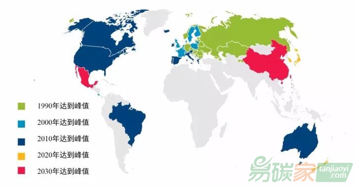 已經(jīng)實現(xiàn)溫室氣體排放峰值水平的國家數(shù)量從1990年的19個增加到2000年的33個、2010年的49個。到2020年,已經(jīng)實現(xiàn)峰值或者承諾將在2020年實現(xiàn)峰值的國家數(shù)量增加到53個。到2030年,這一群體將有更多承諾將在2030年實現(xiàn)峰值的國家加入,使國家數(shù)量達到57個。