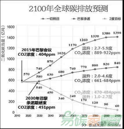 圖一2100年全球碳排放預(yù)測(cè)(數(shù)據(jù)來(lái)源:Science)