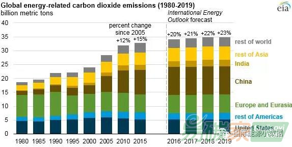 在世界范圍內(nèi),2005-2017年間全球能源相關(guān)碳排放增加了60.40億噸(+21%),平均每年增長1.6%。2005-2007年全球能源相關(guān)碳排放主要來自亞洲(特別是中國、印度),這期間增長62.60億噸;而世界其他地區(qū)的碳排放下降總計下降了2.20億噸。