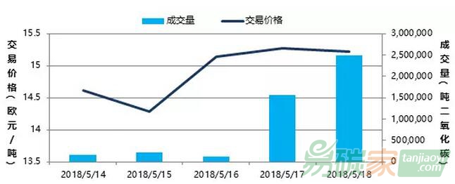 2018年5月14日至2018年5月20日,韓國碳市場(chǎng)價(jià)格在22050-22300韓元/噸(約20.37-20.60美元/噸)之間波動(dòng)。
