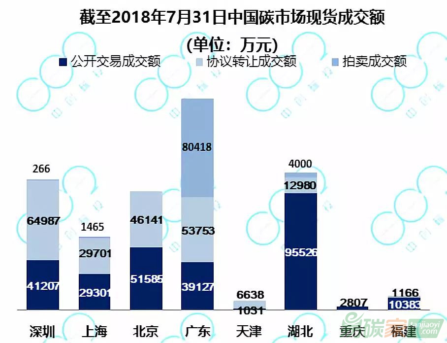 截至2018年7月31日,一、二級(jí)現(xiàn)貨市場(chǎng)累計(jì)成交2.57億噸,成交額57.25億元。廣東、湖北成交量最高,位于第一梯隊(duì);深圳、上海、北京位于第二梯隊(duì);而天津、重慶、福建的成交量相對(duì)較低,位于第三梯隊(duì)。