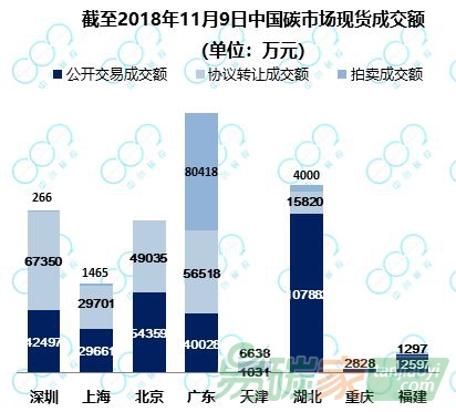 截至2018年11月9日,8個區(qū)域碳市場一、二級現(xiàn)貨市場累計成交2.71億噸,成交額60.33億元。廣東、湖北成交量最高,位于第一梯隊;深圳、上海、北京位于第二梯隊;而天津、重慶、福建的成交量相對較低,位于第三梯隊。