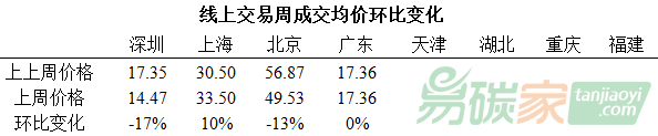 福建市場(chǎng)無(wú)成交。 在近兩周發(fā)生連續(xù)交易的市場(chǎng)內(nèi),各配額市場(chǎng)的價(jià)格走勢(shì)繼續(xù)保持平穩(wěn),價(jià)格浮動(dòng)范圍均不超過(guò)20%,其中廣東的表現(xiàn)最為穩(wěn)定,成交價(jià)格與前一周保持一致,深圳、北京、湖北和重慶的平均成交價(jià)格有所回落,僅上海的成交價(jià)格略有上浮,漲幅為10%。