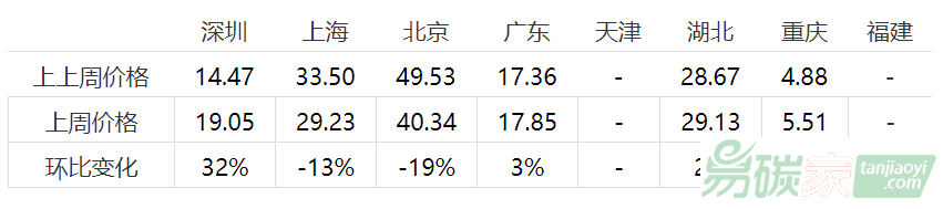 福建市場無成交。 在近兩周發(fā)生連續(xù)交易的市場內(nèi),各配額市場的價(jià)格走勢基本保持平穩(wěn),除深圳價(jià)格漲幅達(dá)到32%之外,其他市場的價(jià)格浮動范圍均不超過20%,其中湖北和廣東的表現(xiàn)最為穩(wěn)定,成交價(jià)格與前一周基本保持一致,上海和北京的平均成交價(jià)格有所下跌,降幅分別為13%和19%,重慶的平均成交價(jià)格有所上浮,漲幅為13%。