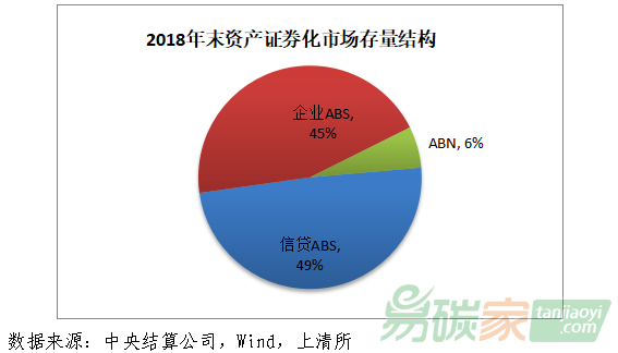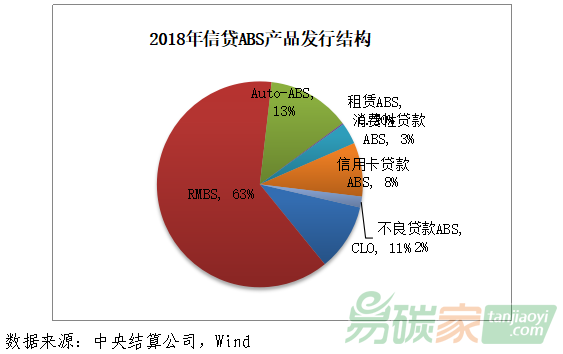信貸ABS中,2018年個人住房抵押貸款支持證券(RMBS)出現(xiàn)爆發(fā)式增長,發(fā)行5842.63億元,同比增長242%,占信貸ABS發(fā)行量的63%;個人汽車抵押貸款支持證券(Auto-ABS)發(fā)行1216.06億元,同比增長11%,占信貸ABS發(fā)行量的13%;公司信貸類資產(chǎn)支持證券(CLO)和信用卡貸款A(yù)BS分別發(fā)行980.56億元和787.85億元,同比下降19%和40%,占比分別為11%和8%;消費性貸款A(yù)BS和不良貸款A(yù)BS分別發(fā)行313.93億元和158.8億元,同比分別增長75%和23%,占比分別為3%和2%;租賃ABS發(fā)行18.51億元,同比下降95%,占0.2%。