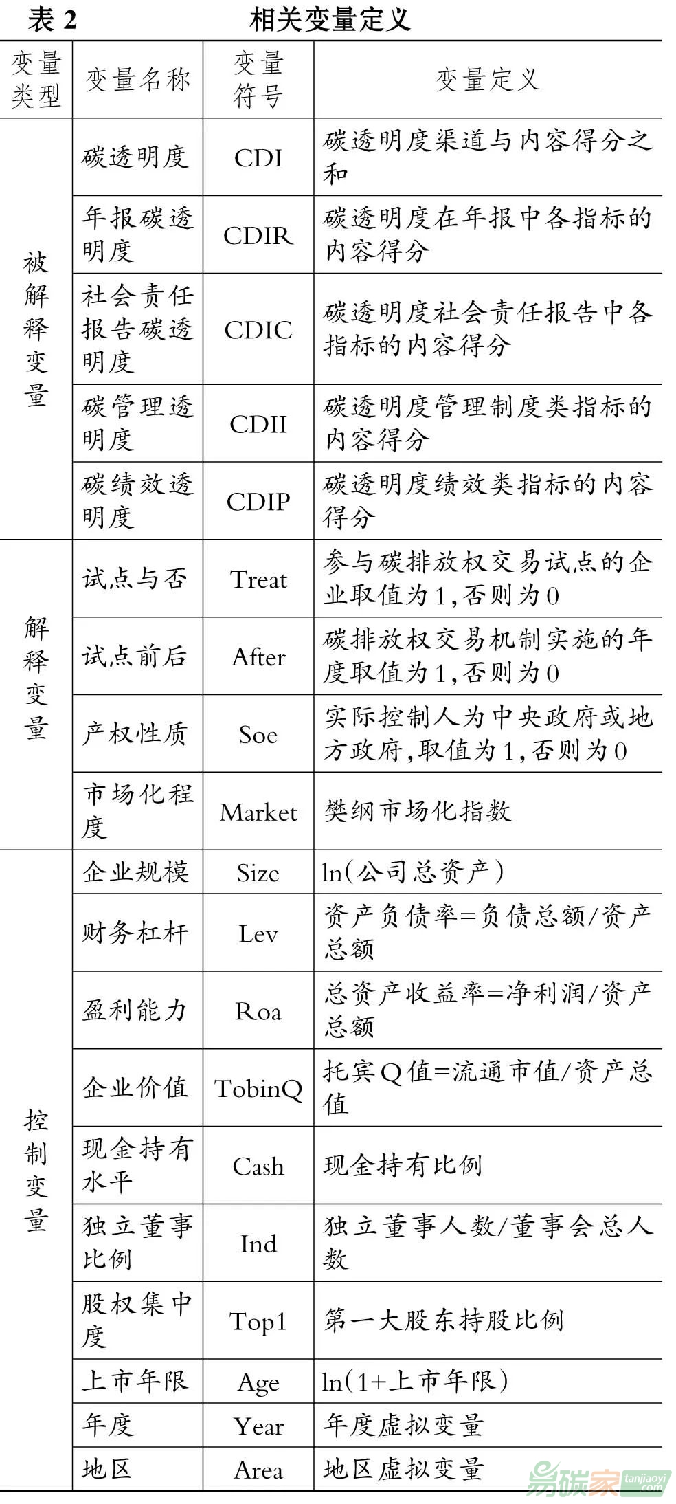 市場(chǎng)155家試點(diǎn)企業(yè),采用傾向得分匹配法,運(yùn)用雙重差分模型,使用內(nèi)容分析法構(gòu)建企業(yè)碳透明度評(píng)價(jià)指標(biāo)體系,實(shí)證檢驗(yàn)碳