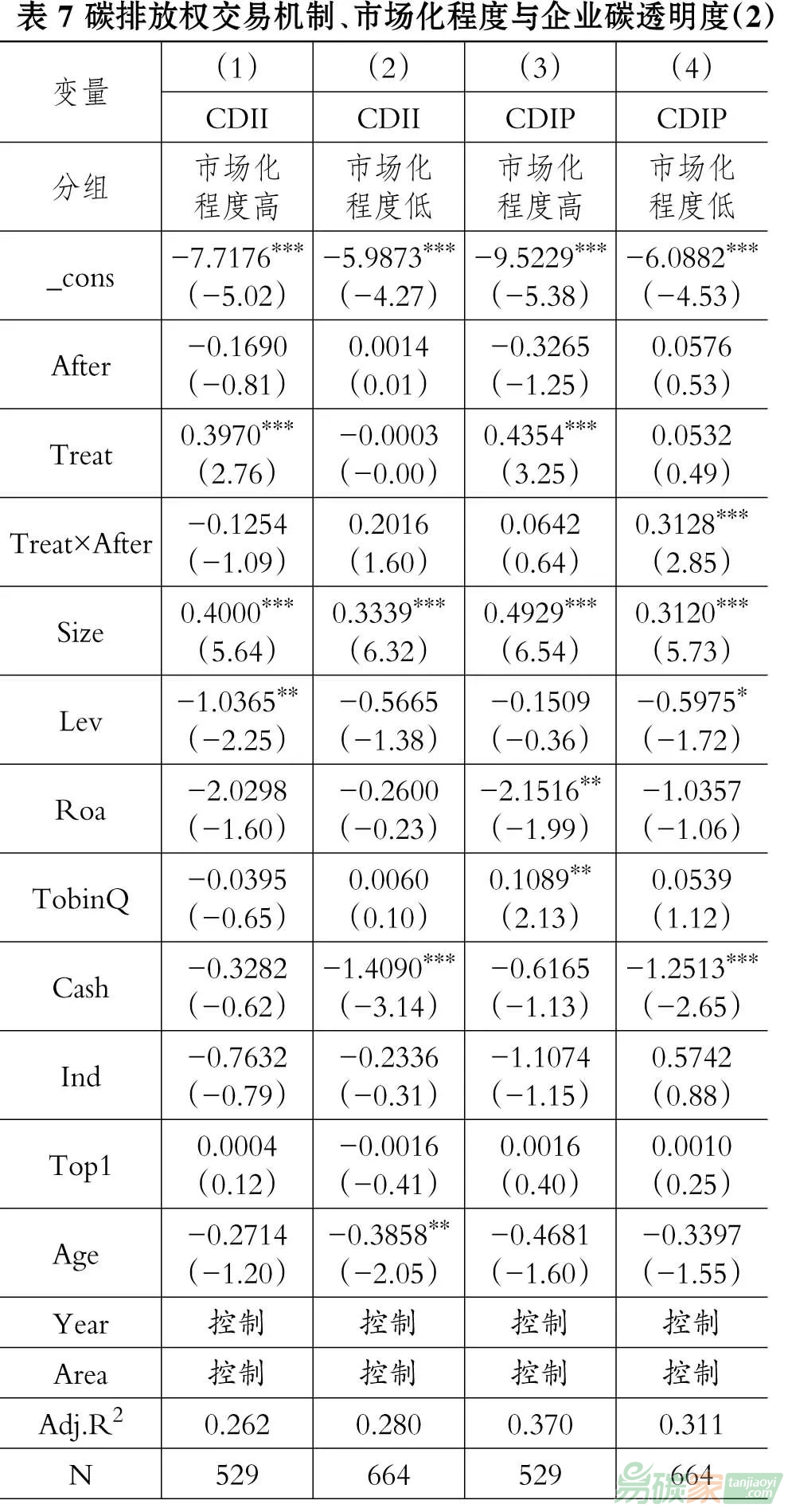 隨后本文分別從市場(chǎng)化程度和產(chǎn)權(quán)性質(zhì)角度考察其對(duì)碳排放權(quán)交易機(jī)制與企業(yè)碳透明度的調(diào)節(jié)效應(yīng),并參考以往文獻(xiàn)[11,18] ,分別在模型中控制了企業(yè)規(guī)模(Size)、財(cái)務(wù)杠桿(Lev)、盈利能力(Roa)、企業(yè)價(jià)值(TobinQ)、現(xiàn)金持有水平(Cash)、獨(dú)立董事比例(Ind)、股權(quán)集中度(Top1)及上市年限(Age)等變量。此外,為盡可能降低地區(qū)和經(jīng)濟(jì)周期對(duì)企業(yè)碳透明度的影響,在模型中還對(duì)年度與地區(qū)進(jìn)行了控制。