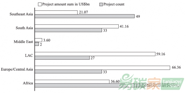 研究中,我們使用GDP中心CGEF數(shù)據(jù)庫(kù)提供的融資數(shù)據(jù),估算了中國(guó)海外能源投資的分布。該數(shù)據(jù)庫(kù)包括2000年至2018年初兩家中國(guó)主要政策性銀行的199項(xiàng)海外投資信息,投資總額達(dá)2281.05億美元,分布在世界七個(gè)地區(qū)(63個(gè)國(guó)家)。