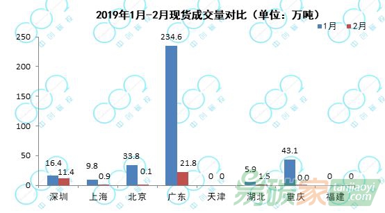 截至2019年2月28日,一、二級現(xiàn)貨市場累計(jì)成交2.86億噸,成交額62.40元。廣東、湖北成交量最高,位于第一梯隊(duì);深圳、上海、北京位于第二梯隊(duì);而天津、重慶、福建的成交量相對較低,位于第三梯隊(duì)。