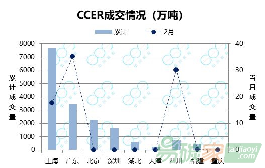 四川市場表現(xiàn)較為活躍,分別成交35.2萬噸和30萬噸,分別占當(dāng)月總成交的42%和36%。截至2019年2月28日,9個(gè)備案的交易所累計(jì)成交CCER 1.71億噸,其中上海累計(jì)成交7649.2萬噸,約占全部成交量的45%。