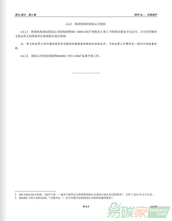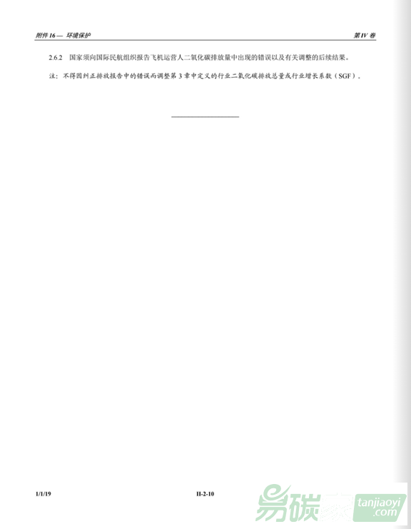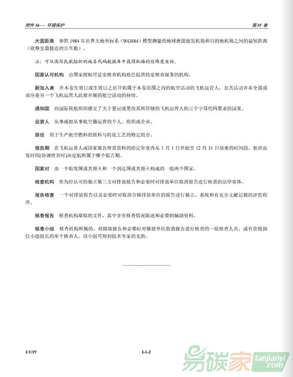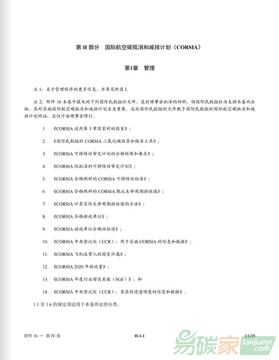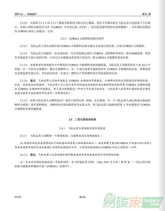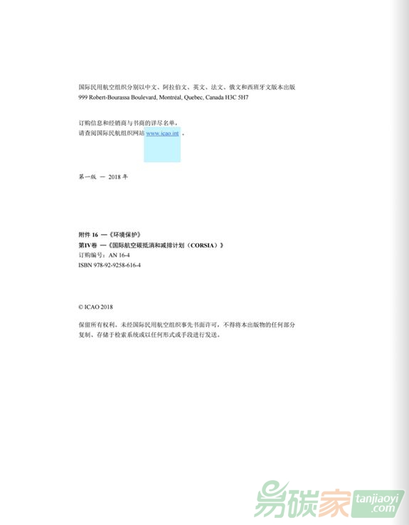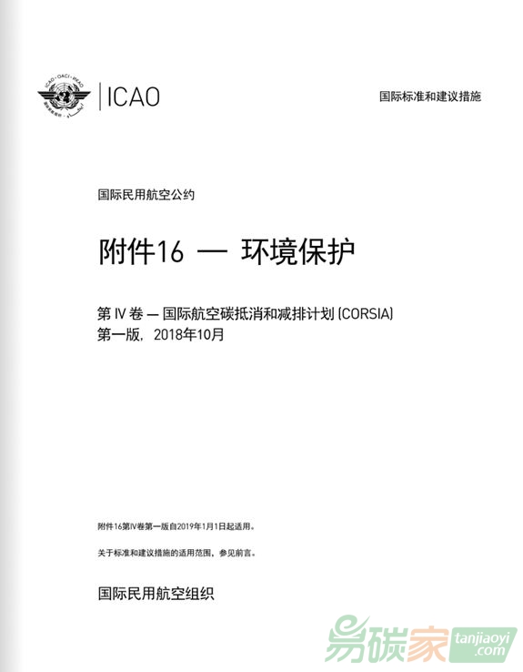 航空公約》(《芝加哥公約》)附件16第IV卷第一版,該文件對(duì)于幫助各國(guó)和航空公司按照既定期限落實(shí)CORSIA至關(guān)重要。附件16第四卷第一版于2018年10月22日起生效,2019年1月1日起生效。