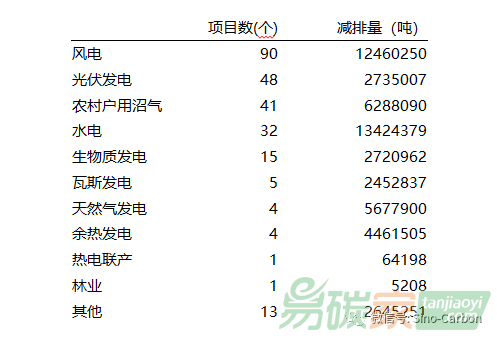 減排量備案項目287個。獲得減排量備案的項目中掛網(wǎng)公示254個,合計備案減排量5283萬噸CO2e。從項目類別看,已獲得減排量備案且材料公示的254個項目中,有第一類項目139個,合計備案減排量1890萬噸CO2e;第二類項目17個,備案減排量372萬噸CO2e;第三類項目98個,備案減排量3031萬噸CO2e。從項目類型看,風(fēng)電、光伏、農(nóng)村戶用沼氣、水電等項目較多,詳細(xì)情況如下圖所示:
