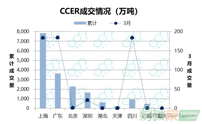 四川CCER均有成交,累計成交量573.46萬噸,較2月(83.08萬噸)擴大了近6倍。