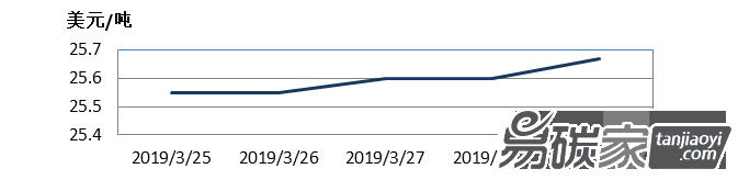 新西蘭碳市場(chǎng)2019年03月25日至2019年03月31日,新西蘭碳市場(chǎng)價(jià)格在25.55-25.67美元/噸之間波動(dòng)。