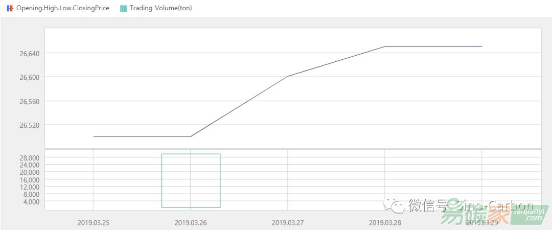 韓國(guó)碳市場(chǎng)2019年03月25日至2019年03月31日,韓國(guó)碳市場(chǎng)價(jià)格在26500-26650韓元/噸之間波動(dòng)(約23.38-23.51美元/噸)。