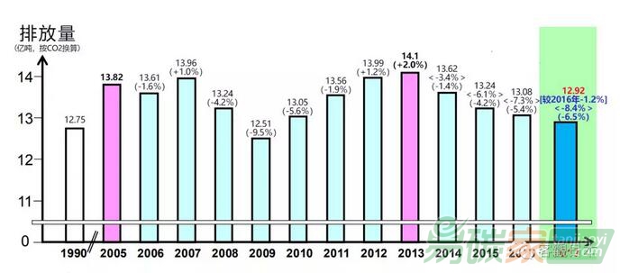 日本環(huán)境省和國立環(huán)境研究所匯總確定了2017年度日本的溫室氣體排放量,總排放量為12.92億噸(按二氧化碳換算,以下相同),同比減少1.2%(比2013年度減少8.4%,比2005年度減少6.5%)。排放量較上一年度減少的原因之一是,光伏發(fā)電和風(fēng)力發(fā)電等可再生能源導(dǎo)入量的增加以及核電站重新投入運(yùn)轉(zhuǎn),非化石燃料在日本的能源供應(yīng)量中的占比升高,來自能源的二氧化