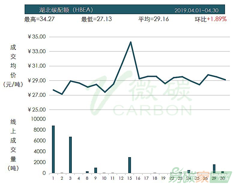 碳配額在4月中旬以連續(xù)13個(gè)漲停板拉升至30.00元/噸的價(jià)格水平;全月交易量合計(jì)僅為1.67萬(wàn)噸。