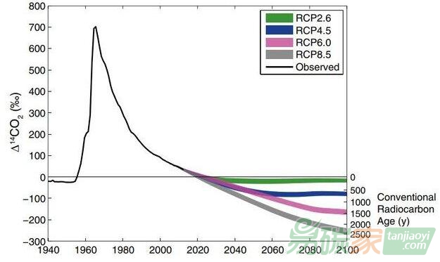 同樣有趣的是,人類活動也從另一個方向影響了這一現(xiàn)象。由于核彈和核試驗,生成了更多的類似于宇宙射線的能量。根據(jù)文獻(xiàn)記載,大氣中14C的濃度在1950年到1960年間幾乎翻了一番。但是由于碳循環(huán)有很大的下沉量,這個峰值在幾十年后下降了,