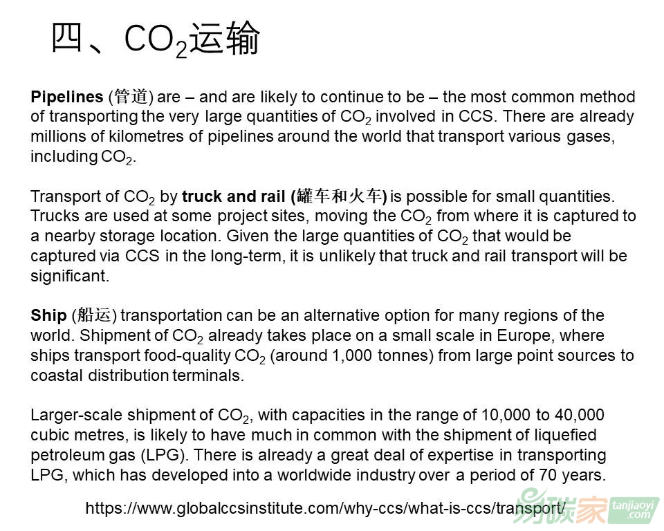 運輸,當(dāng)然就近封存是最好的,但因為捕集源或排放源和封存的場地有一定的距離,有一些地方需要運輸,一種是罐車運輸,一種是管道運輸。運輸涉及到兩個問題,一個就是成本,一個就是安全性。