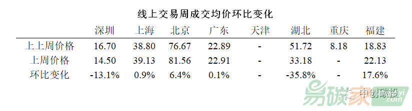 在連續(xù)兩周發(fā)生交易的區(qū)域市場中,上周湖北市場價(jià)格明顯下降,降幅超過35%;深圳市場價(jià)格下降了13%;福建市場價(jià)格略有上漲,漲幅近18%;其他試點(diǎn)市場價(jià)格較前一周表現(xiàn)穩(wěn)定,浮動范圍均未超過10%。上周重慶、天津配額市場線上無成交。