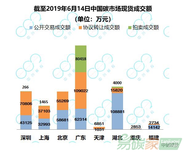 截至2019年6月14日,8個(gè)區(qū)域碳市場一、二級現(xiàn)貨市場累計(jì)成交3.26億噸,總成交額70.80億元。廣東、湖北成交量最高,位于第一梯隊(duì);深圳、上海、北京位于第二梯隊(duì);而天津、重慶、福建的成交量相對較低,位于第三梯隊(duì)。