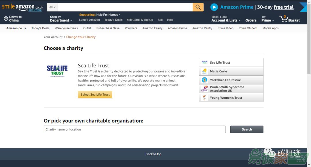 另外一個(gè)案例,亞馬遜推出了一個(gè)網(wǎng)站叫smile.amazon.com, 在這個(gè)網(wǎng)站上購(gòu)物與亞馬遜主網(wǎng)站上沒(méi)什么差別,而smile網(wǎng)站突出了一點(diǎn):用戶在進(jìn)入該網(wǎng)站后,需要選擇一個(gè)公益項(xiàng)目,如海洋保護(hù)、植樹(shù)造林等,亞馬遜承諾用戶在smile網(wǎng)站上每消費(fèi)一次,亞馬遜將為公益項(xiàng)目做一次捐贈(zèng)(捐款金額為用戶消費(fèi)金額的千分之五)。消費(fèi)者可以通過(guò)自己的選擇,非常簡(jiǎn)單的做社會(huì)公益。