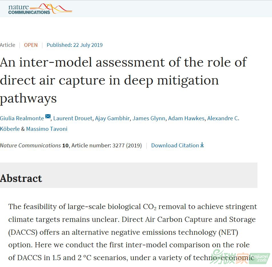日前《自然·通訊》雜志發(fā)表意大利、英國等國學者的文章認為,一種可行的負排放技術(shù)是直接將二氧化碳從大氣中捕獲,然后將二氧化碳然后埋在地下,該過程被稱為直接空氣碳捕獲和儲存(as direct air carbon capture and storage ,DACCS)。