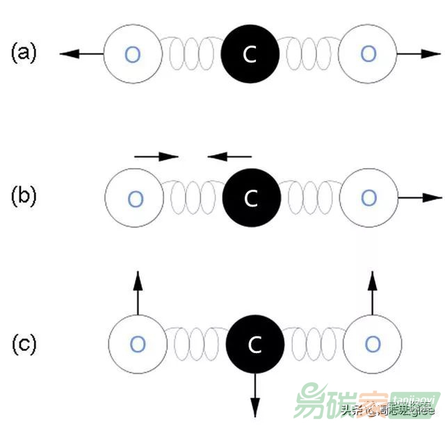 氧氣分子的雙鍵連接由于氮?dú)夂脱鯕舛际怯蓮?qiáng)鍵連接,其結(jié)構(gòu)穩(wěn)定,那些穿過(guò)了大氣層的光子能量通常不足以激發(fā)它們振動(dòng);當(dāng)它們被光子激發(fā)時(shí),分子僅在軸向上發(fā)生極輕微的線性振動(dòng),兩個(gè)原子間像是連著一根硬彈簧,它們只是稍稍靠近又稍稍遠(yuǎn)離,因此氮?dú)夂脱鯕饣静粚?duì)外輻射熱能,也不被認(rèn)為是溫室氣體。擁有3個(gè)或更多原子的分子可以以更復(fù)雜的模式振動(dòng)。單個(gè)分子可以以各種方式振動(dòng);這些不同運(yùn)動(dòng)中的每一個(gè)被稱為一種振動(dòng)“模式”。二氧化碳(CO?)分子具有三種不同的振動(dòng)模式,如下圖所示: