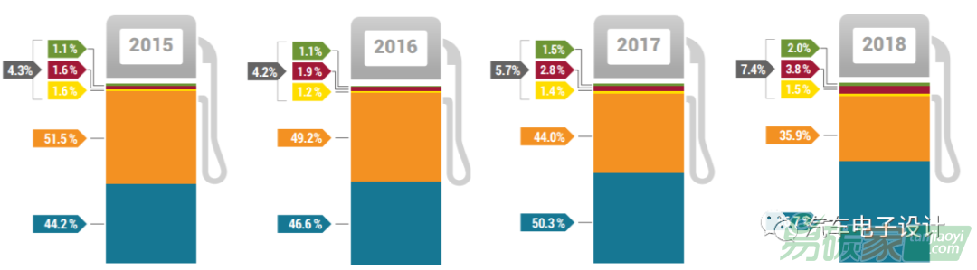 我們可以看到在2015年的達(dá)標(biāo)下,柴油車也達(dá)到了一個(gè)階段性的頂峰。這個(gè)拐點(diǎn)是排放門事件深遠(yuǎn)的影響,基本把這條路線打廢了。
