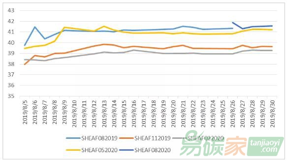 8月26日至8月30日,上海碳配額遠期中央對手清算業(yè)務保持平穩(wěn)運行。8月27日開市前,2019年8月協(xié)議完成最終結算,協(xié)議最終結算價為41.35元/噸;開市后,2020年8月協(xié)議開始流通。價格方面,四個流通協(xié)議價格整體上揚,其中,2019年11月協(xié)議期末結算價39.63元/噸,較上周五環(huán)比上漲0.15元/噸,2020年2月協(xié)議期末結算價39.27元/噸,較上周五環(huán)比上漲0.31元/噸。