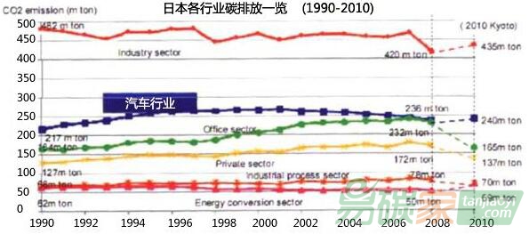 雖然現(xiàn)在日本汽車的二氧化碳排放量比1990年有所增加,但是該排放量自從2001年達(dá)到峰值以來,就一直處于下降態(tài)勢(shì)。