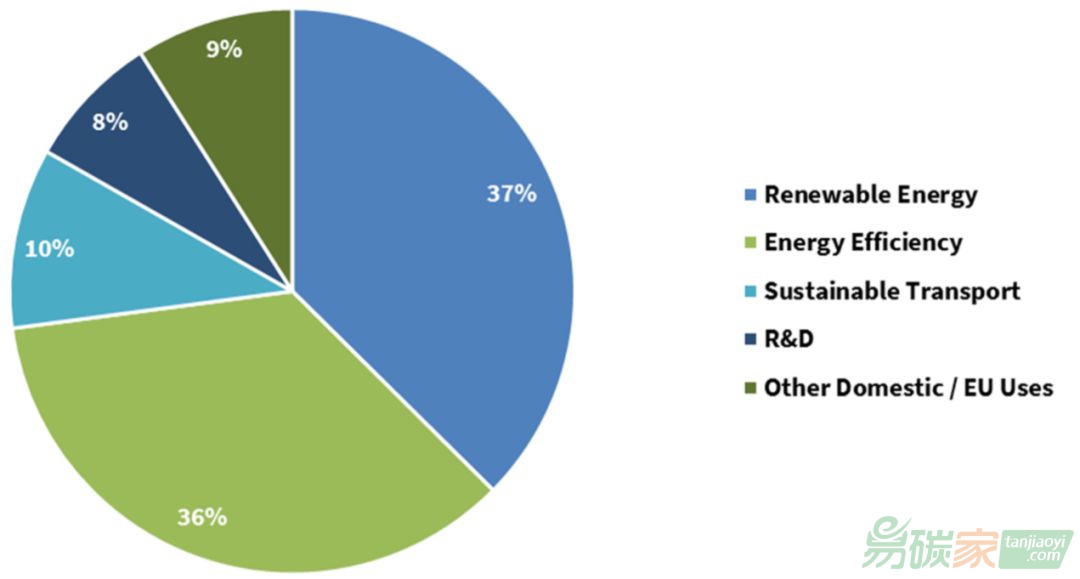在EU ETS下,成員國有權決定如何使用其拍賣配額的收入。即使《歐盟排放交易體系指令》鼓勵成員國將其至少一半的拍賣收入用于氣候和能源項目,但在2013年至2017年間,約有80%的拍賣收入用于或計劃用于氣候和能源項目[2]。歐盟建立了一個NER300基金來支持低碳創(chuàng)新,資金來源于歐盟拍賣3億個配額的收入,以支持碳捕獲和封存項目以及可再生能源創(chuàng)新計劃。由NER300基金資助的38個項目也由各成員國共同資助,預計將使歐盟的可再生能源產量增加18TWh并減少大量碳排放。該基金將在第四階段(2021-2030)由創(chuàng)新基金(Innovation Fund)取代,它將出售4.5億-5.0億的碳配額。能源效率項目在2013-2017年間成為EU ETS第二大拍賣收入支出的類別,所有成員國需要報告他們如何將其中一部分資金用于支持能效項目。例如,捷克和法國都制定了改善家庭能效措施的計劃,而保加利亞則專注于為公共建筑提供