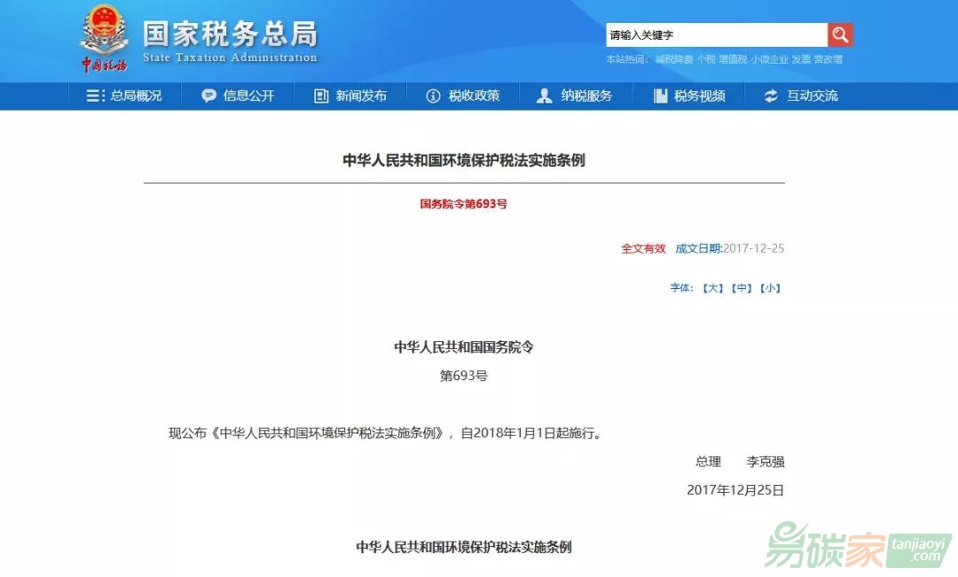《中華人民共和國環(huán)境保護(hù)稅法實施條例》自2018年1月1日起施行